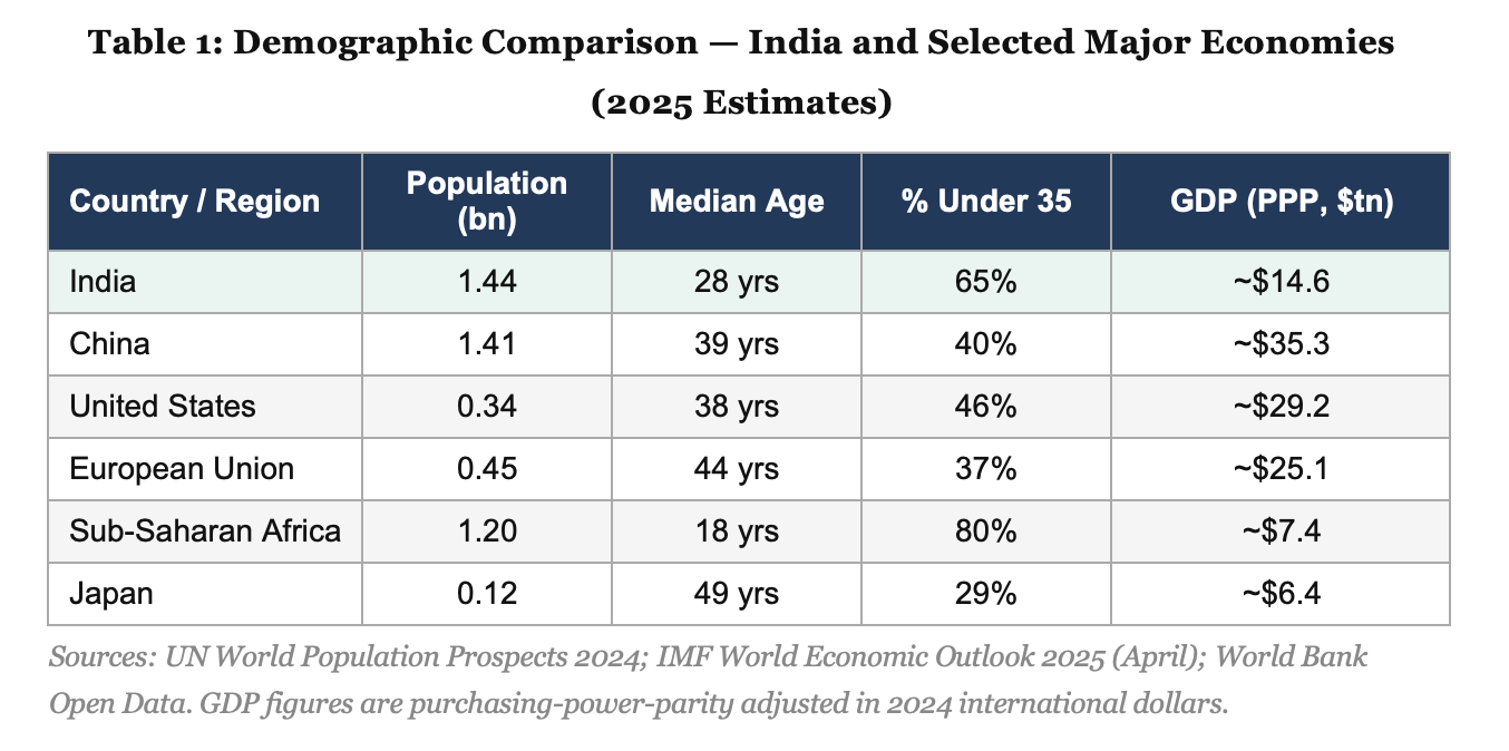India became the world’s most populous nation in 2023, surpassing China with approximately 1.44 billion people. The structural character of India’s population, however, is as consequential as its scale. India’s median age in 2025 is approximately 28 years, compared to China’s 39 years, the European Union’s 44 years, and Japan’s 49 years. With 65% of its population below the age of 35 and over 600 million people below 25, India possesses a demographic profile that will generate a labour force dividend of historic proportions through at least 2045 — what economists term the ‘demographic sweet spot’ of high working-age population share and low dependency ratios.
